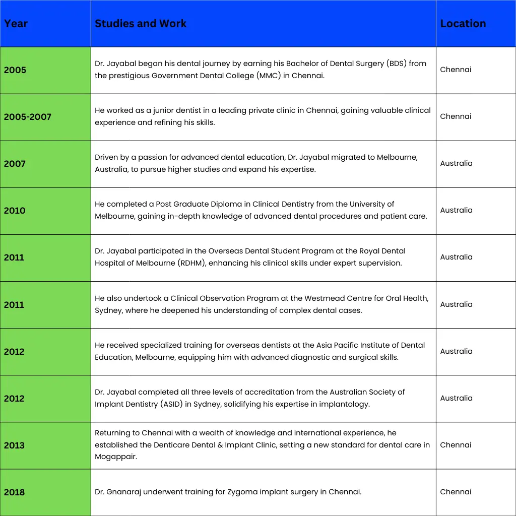 Dr. Jayabal began his dental journey by earning his Bachelor of Dental Surgery (BDS) from the prestigious Government Dental College (MMC) in Chennai.